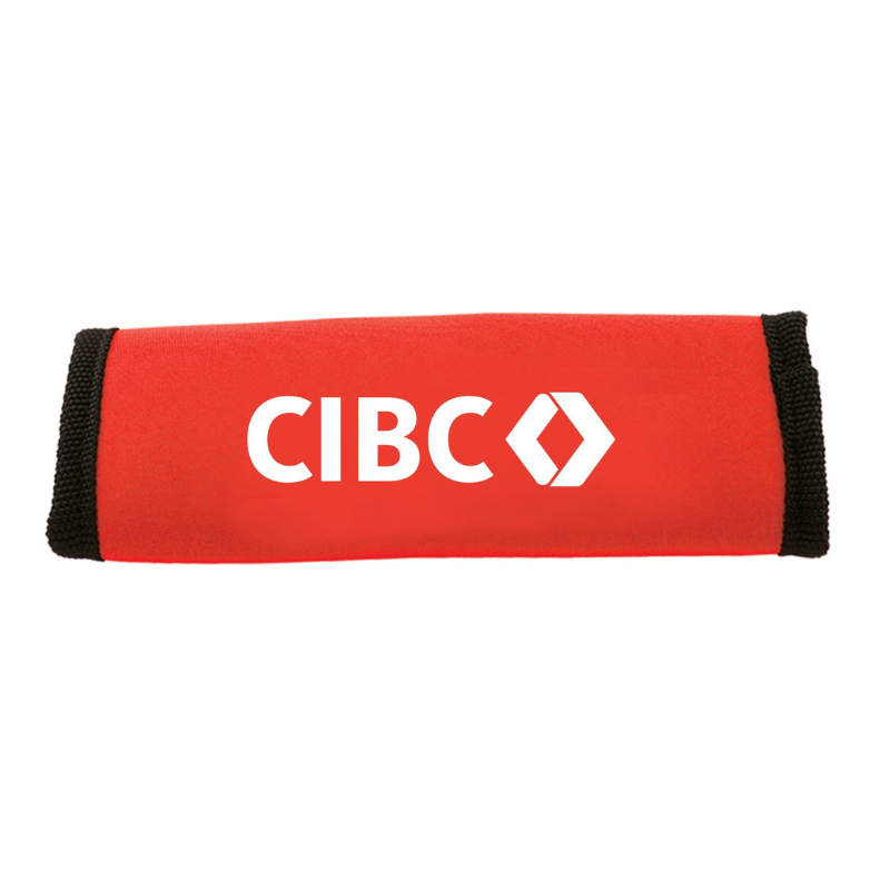 Luggage identifier handle covers are handy accessories that serve both practical and aesthetic purposes when it comes to traveling with luggage. The primary purpose of handle covers is to help you quickly identify your luggage on a crowded baggage carousel or in a sea of similar-looking bags. The red cover with CIBC logo will definitely stand out in the crowd!