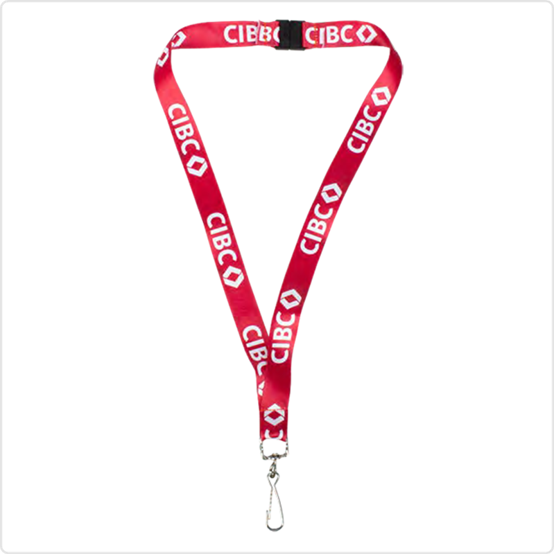 Constructed out of flat ribbed polyester material, this 3/4" wide lanyard offers excellent detail and clarity. The CIBC logo really stands out on the red lanyard. The breakaway clasp makes it safe for kids to use- you could distribute to local schools for ID badges. The swivel j-hook attachment can be used for keys, badges and other credentials. Dimensions: 3/4" x 37"