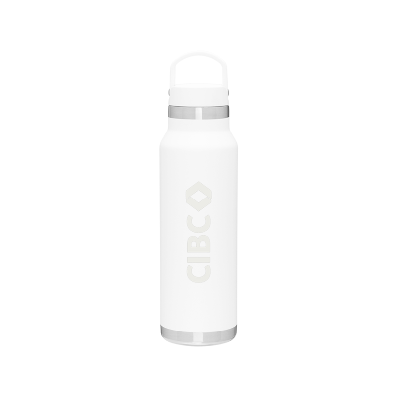 25 oz double wall 18/8 stainless steel thermal bottle with copper vacuum insulation, threaded insulated lid with carrying handle, high polish accent, stainless steel base, and powder coated finish · gift box included Hand wash recommended. Do not microwave.