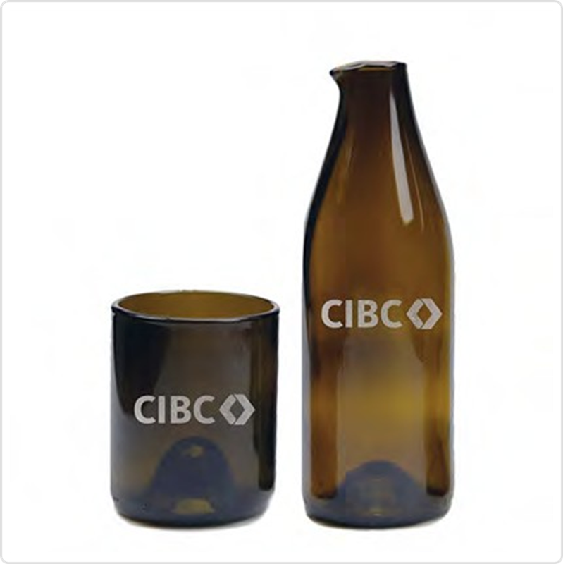 This recycled set is etched with the CIBC logo. This product diverts huge amounts of waste glass from landfills every week. Check out this video to see how they are made. Comes in recycled packaging.